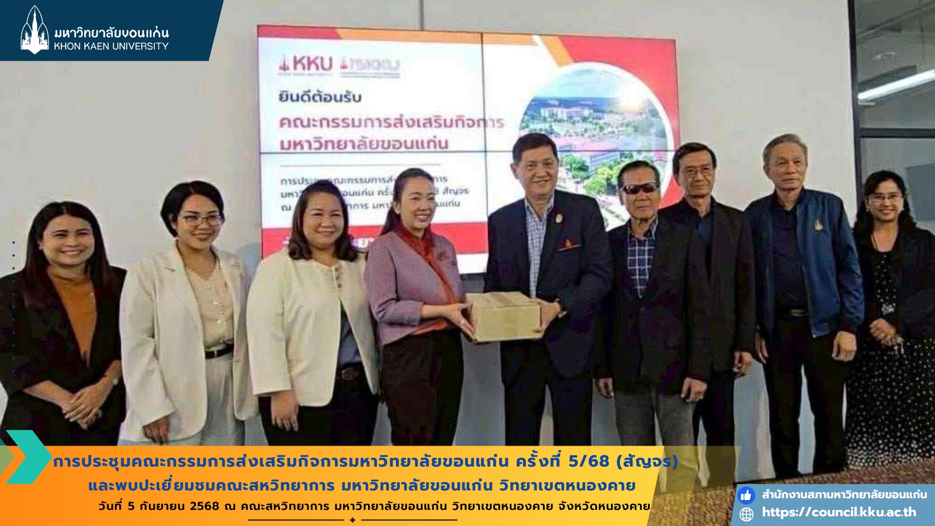 เมื่อวันที่ 5 กันยายน 2568 เวลา 10.30 น. ณ ห้องประชุมคณะสหวิทยาการ มหาวิทยาลัยขอนแก่น วิทยาเขตหนองคาย คณะกรรมการส่งเสริมกิจการมหาวิทยาลัย นำโดย นายสุกิจ ศิรินรกุล ประธานคณะกรรมการฯ ประชุมคณะกรรมการส่งเสริมกิจการมหาวิทยาลัยขอนแก่น ครั้งที่ 5/2568 (สัญจร) และพบปะเยี่ยมชมคณะสหวิทยาการ มหาวิทยาลัยขอนแก่น วิทยาเขตหนองคาย โดยที่ประชุมได้หารือประเด็นสำคัญในการส่งเสริมและสนับสนุการบริหารงานของคณะสหวิทยาการ และเยี่ยมชมคณะ พร้อมรับฟังบรรยายการบริหารจัดการคณะสหวิทยาการ โดย ผศ.ดร.สุนทรี บูชิตชน คณบดีคณะสหวิทยาการ ซึ่งได้รับการต้อนรับจากคณะผู้บริหาร และบุคลากร คณะสหวิทยาการ มหาวิทยาลัยขอนแก่น วิทยาเขตหนองคาย