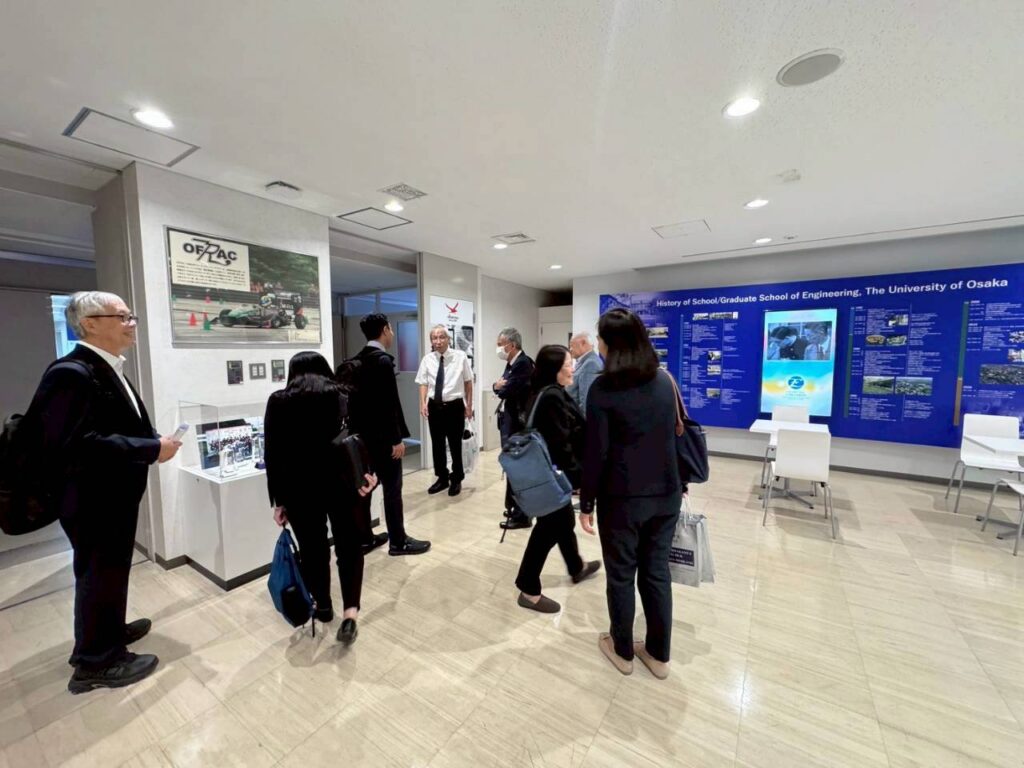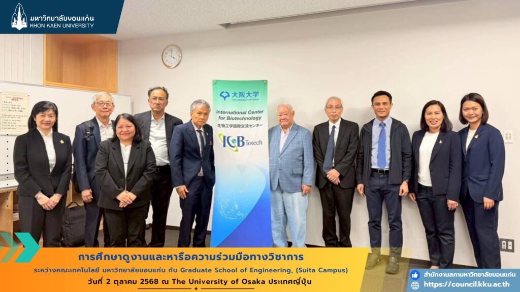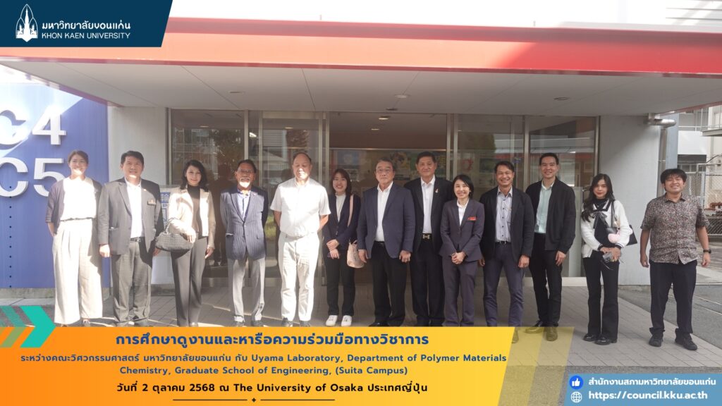 และช่วงบ่ายวันที่ 2 ตุลาคม 2568 ดร.ณรงค์ชัย อัครเศรณี นายกสภามหาวิทยาลัย รศ.นพ.ชาญชัย พานทองวิริยะกุล อธิการบดีมหาวิทยาลัยขอนแก่น กรรมการสภามหาวิทยาลัยผู้ทรงคุณวุฒิ และผู้บริหาร คณาจารย์คณะแพทยศาสตร์ คณะวิศวกรรมศาสตร์ คณะเทคโนโลยี และคณะมนุษยศาสตร์และสังคมศาสตร์ มหาวิทยาลัยขอนแก่น ได้ศึกษาดูงานวิทยาเขตของมหาวิทยาลัยโอซากา ทั้งหมด 4 วิทยาเขต เพื่อหารือความร่วมมือทางวิชาการร่วมกับมหาวิทยาลัยขอนแก่น ดังนี้