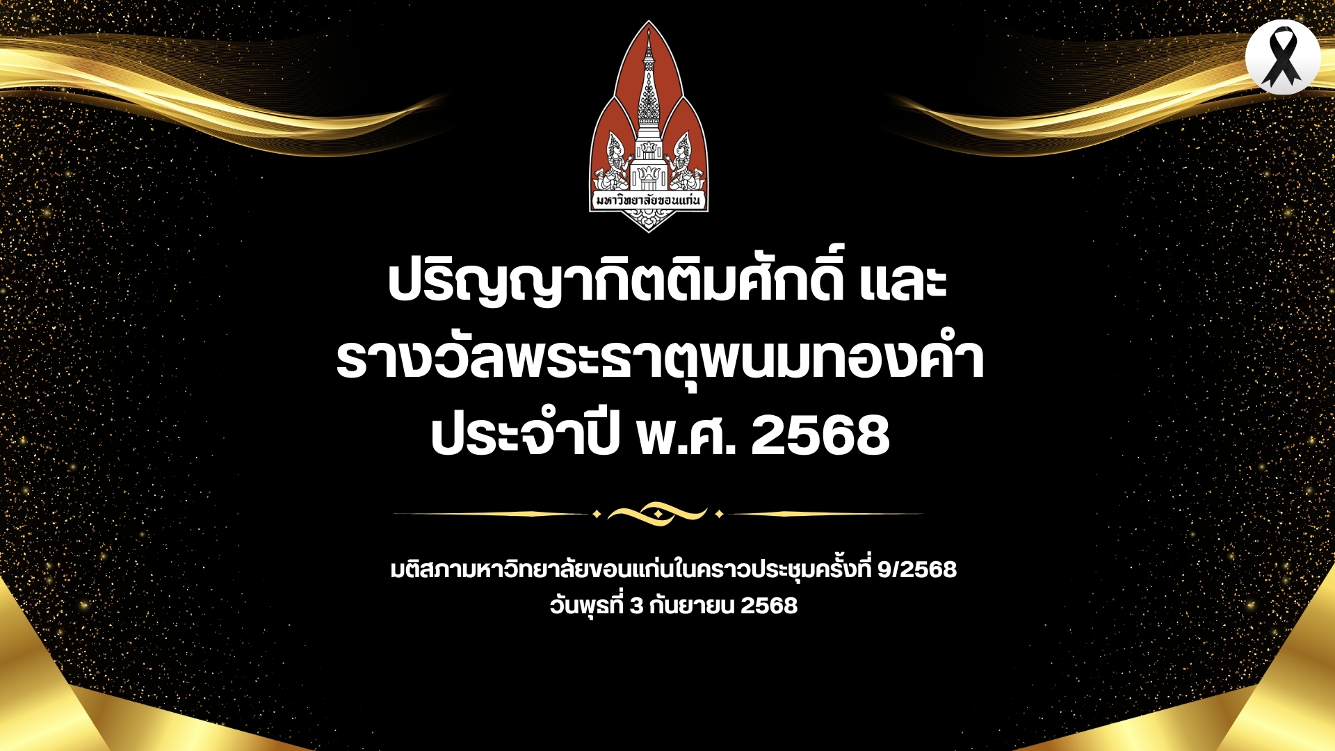 สภามหาวิทยาลัยขอนแก่น มีมติเห็นชอบอนุมัติรายชื่อผู้สมควรได้รับปริญญากิตติมศักดิ์ และรางวัลพระธาตุพนมทองคำ ประจำปี พ.ศ. 2568 17 November 202517 November 2025 kku ข่าวประชาสัมพันธ์ ปริญญากิตติมศักดิ์ อนุมัติทูลเกล้าทูลกระหม่อมถวายปริญญา ปรัชญาดุษฎีบัณฑิตกิตติมศักดิ์ (วิทยาศาสตร์การเกษตรและสิ่งแวดล้อม) แด่ “สมเด็จพระกนิษฐาธิราชเจ้า กรมสมเด็จพระเทพรัตนราชสุดาฯ สยามบรมราชกุมารี” อนุมัติปริญญา ศึกษาศาสตรดุษฎีบัณฑิตกิตติมศักดิ์ (นวัตกรรม เทคโนโลยีและ วิทยาการเรียนรู้) แก่ “ศาสตราจารย์ ดร.ศุภชัย ปทุมนากุล” ปลัดกระทรวงการอุดมศึกษา วิทยาศาสตร์ วิจัย และนวัตกรรม อนุมัติปริญญา ดุริยางคศาสตรดุษฎีบัณฑิตกิตติมศักดิ์ (ดุริยางคศิลป์) แก่ “นายสลา คุณวุฒิ” ศิลปินแห่งชาติ รางวัลพระธาตุพนมทองคำ ประเภทบุคคล อนุมัติรางวัลพระธาตุพนมทองคำ ประเภทบุคคล แก่ “นายสุทธิพงษ์ สุริยะ” กรรมการผู้จัดการ บริษัท ขาบสไตล์ จำกัด จังหวัดบึงกาฬ ตามมติสภามหาวิทยาลัยขอนแก่น ในคราวประชุมครั้งที่ 9/2568 เมื่อวันที่ 3 กันยายน 2568 >>>รายละเอียดมติ<<<
