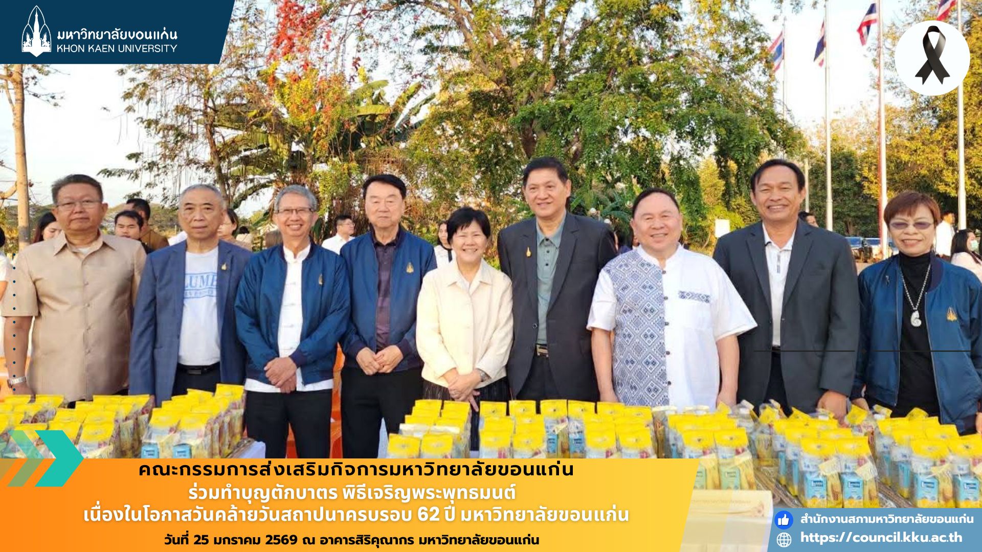 เมื่อวันที่ 25 มกราคม 2569 คณะกรรมการส่งเสริมกิจการมหาวิทยาลัยขอนแก่น โดย นายสุกิจ ศิรินรกุล ประธานคณะกรรม พร้อมด้วยคณะกรรมการส่งเสริมกิจการมหาวิทยาลัยขอนแก่น ร่วมทำบุญตักบาตร พิธีเจริญพระพุทธมนต์ เนื่องในโอกาสวันคล้ายวันสถาปนาครบรอบ 62 ปี มหาวิทยาลัยขอนแก่น ณ อาคารสิริคุณากร มหาวิทยาวิทยาลัยขอนแก่น