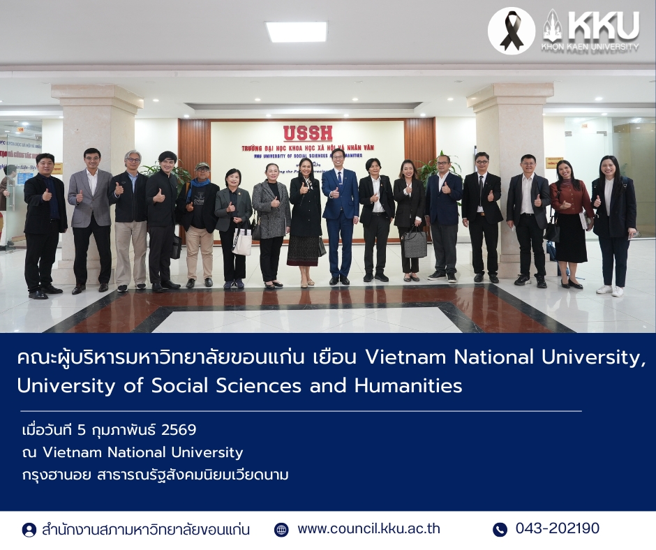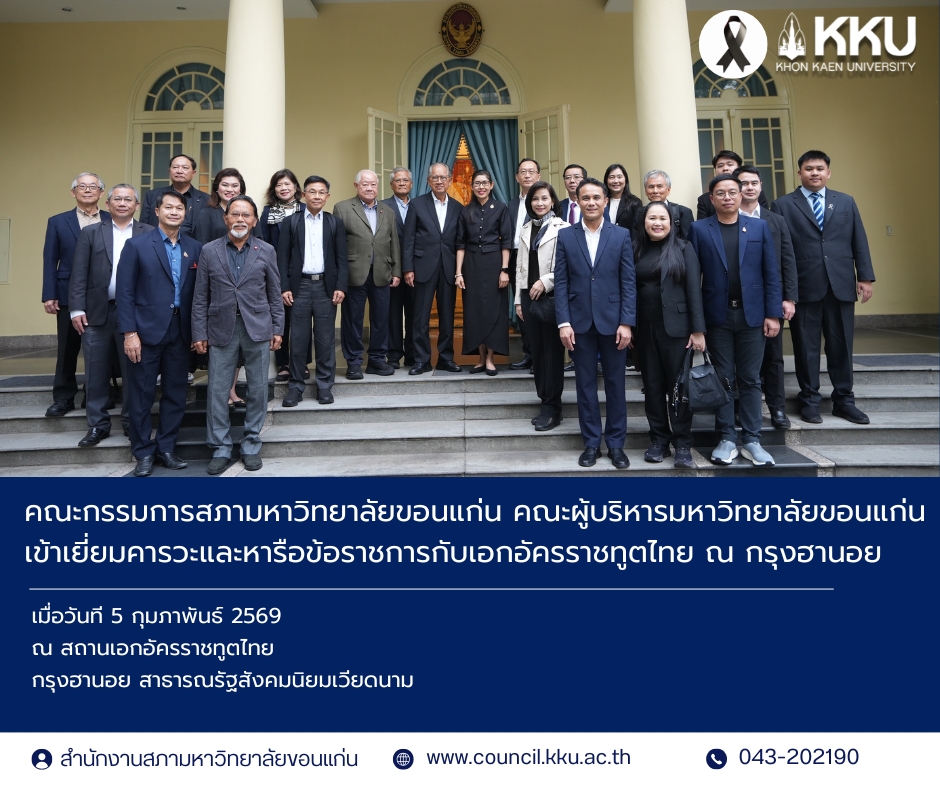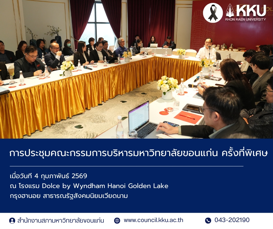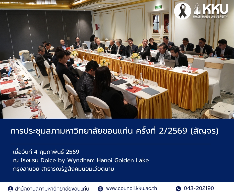 วันที่ 4 กุมภาพันธ์ 2569 สภามหาวิทยาลัยขอนแก่น ได้จัดการประชุมสภามหาวิทยาลัย (สัญจร) ครั้งที่ 2/2569 ณ โรงแรม Dolce by Wyndham Hanoi Golden Lake กรุงฮานอย สาธารณรัฐสังคมนิยมเวียดนาม โดยสาระสำคัญในการประชุมตามรายละเอียดดังนี้ https://kku.world/aw5r4e