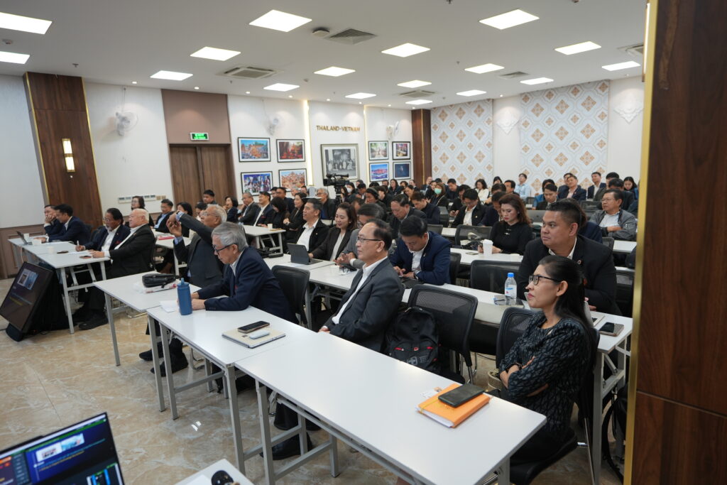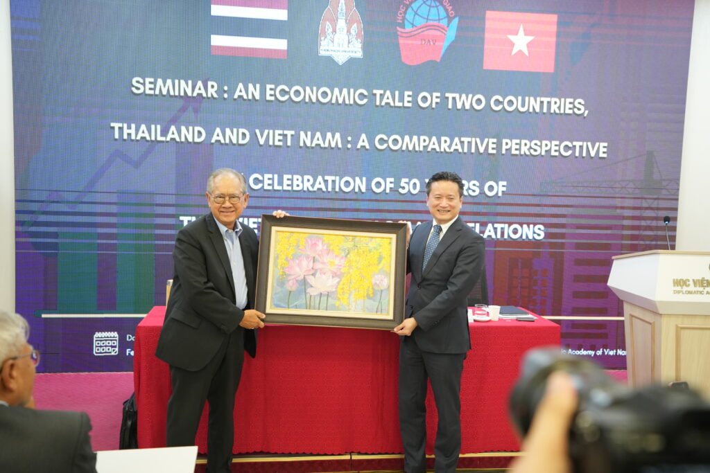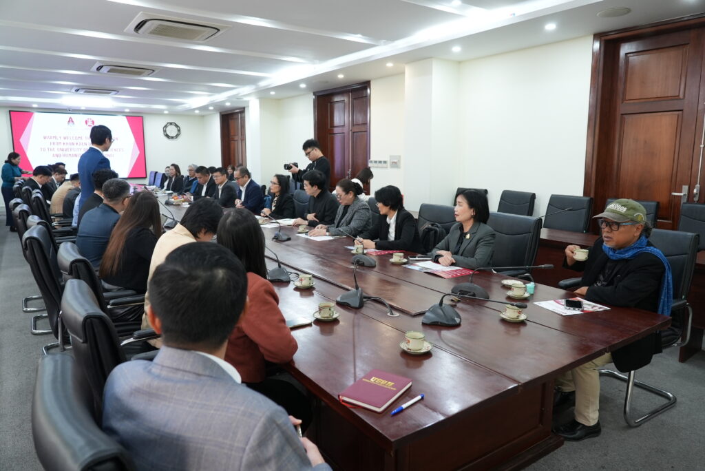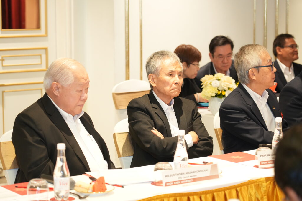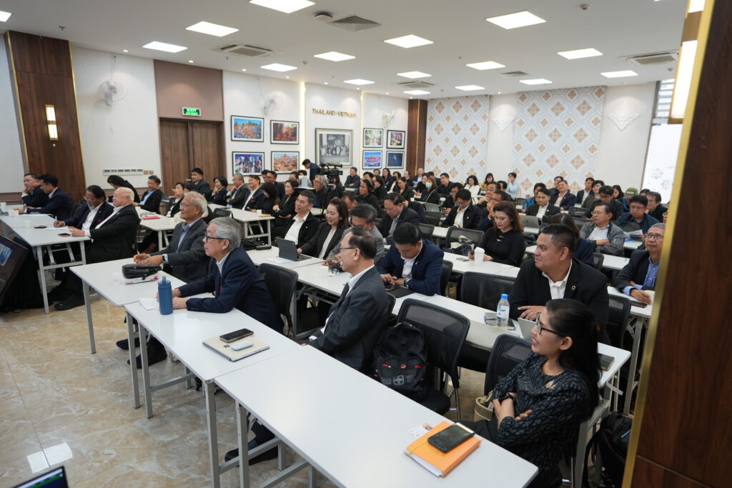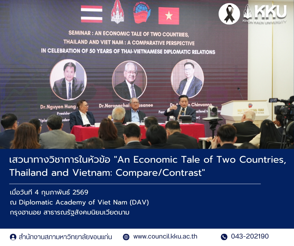 ช่วงบ่ายคณะกรรมการสภามหาวิทยาลัยและคณะผู้บริหารมหาวิทยาลัยขอนแก่น ได้เข้าร่วมกิจกรรมเสวนาทางวิชาการในหัวข้อ “An Economic Tale of Two Countries, Thailand and Vietnam: Compare/Contrast” เพื่อแลกเปลี่ยนมุมมองด้านเศรษฐกิจและการพัฒนาประเทศ โดยได้รับเกียรติจากวิทยากรผู้ทรงคุณวุฒิระดับสูง ได้แก่ Dr. Nguyen Hung Son อธิการบดีสถาบันการทูตเวียดนาม (Diplomatic Academy of Vietnam), ดร.ณรงค์ชัย อัครเศรณี นายกสภามหาวิทยาลัยขอนแก่น และ ดร.อนุสนธิ์ ชินวรรโณ อดีตเอกอัครราชทูตไทยประจำเวียดนาม ร่วมเป็นวิทยากรและผู้ดำเนินรายการ การบรรยายนี้สะท้อนบทบาทของมหาวิทยาลัยในการเป็น “ปัญญาของสังคม” ที่เชื่อมโยงความรู้ระดับสากลสู่การพัฒนาท้องถิ่นและระดับชาติ