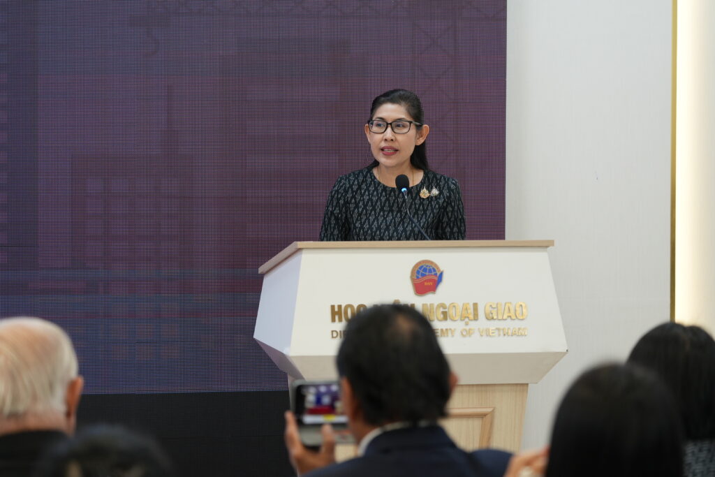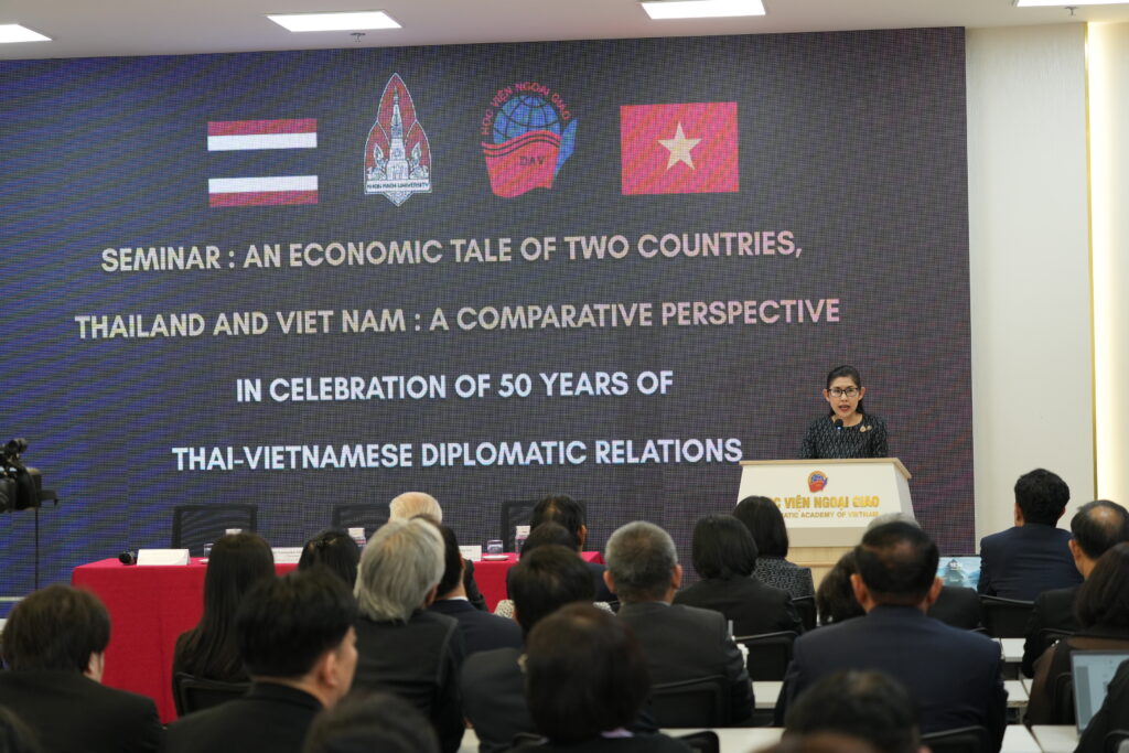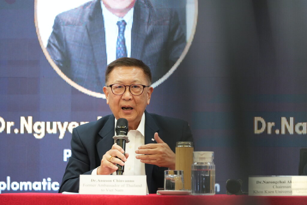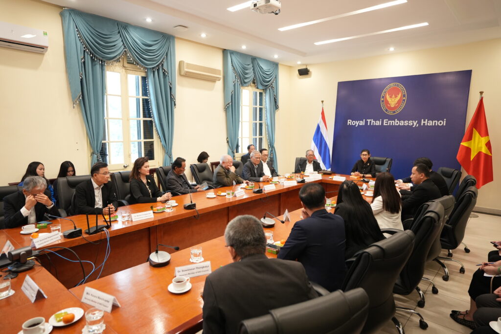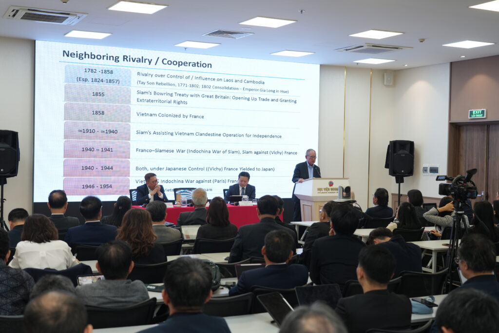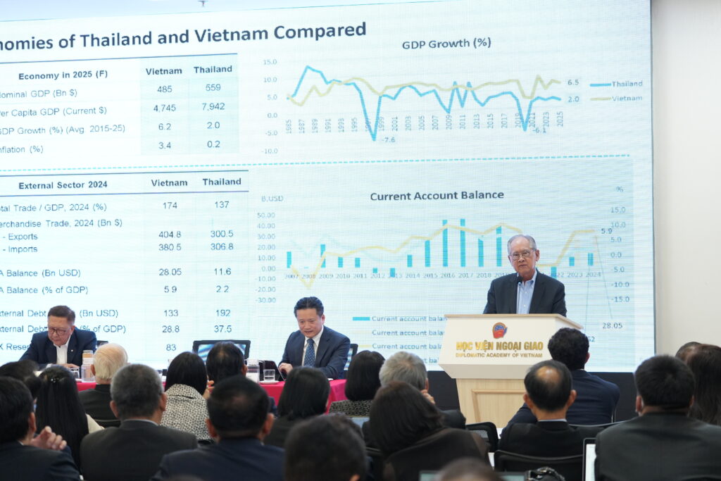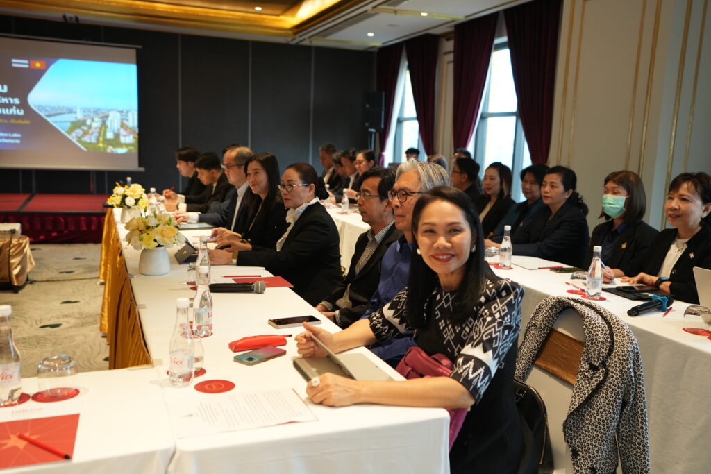 ช่วงบ่ายคณะกรรมการสภามหาวิทยาลัยและคณะผู้บริหารมหาวิทยาลัยขอนแก่น ได้เข้าร่วมกิจกรรมเสวนาทางวิชาการในหัวข้อ “An Economic Tale of Two Countries, Thailand and Vietnam: Compare/Contrast” เพื่อแลกเปลี่ยนมุมมองด้านเศรษฐกิจและการพัฒนาประเทศ โดยได้รับเกียรติจากวิทยากรผู้ทรงคุณวุฒิระดับสูง ได้แก่ Dr. Nguyen Hung Son อธิการบดีสถาบันการทูตเวียดนาม (Diplomatic Academy of Vietnam), ดร.ณรงค์ชัย อัครเศรณี นายกสภามหาวิทยาลัยขอนแก่น และ ดร.อนุสนธิ์ ชินวรรโณ อดีตเอกอัครราชทูตไทยประจำเวียดนาม ร่วมเป็นวิทยากรและผู้ดำเนินรายการ การบรรยายนี้สะท้อนบทบาทของมหาวิทยาลัยในการเป็น “ปัญญาของสังคม” ที่เชื่อมโยงความรู้ระดับสากลสู่การพัฒนาท้องถิ่นและระดับชาติ