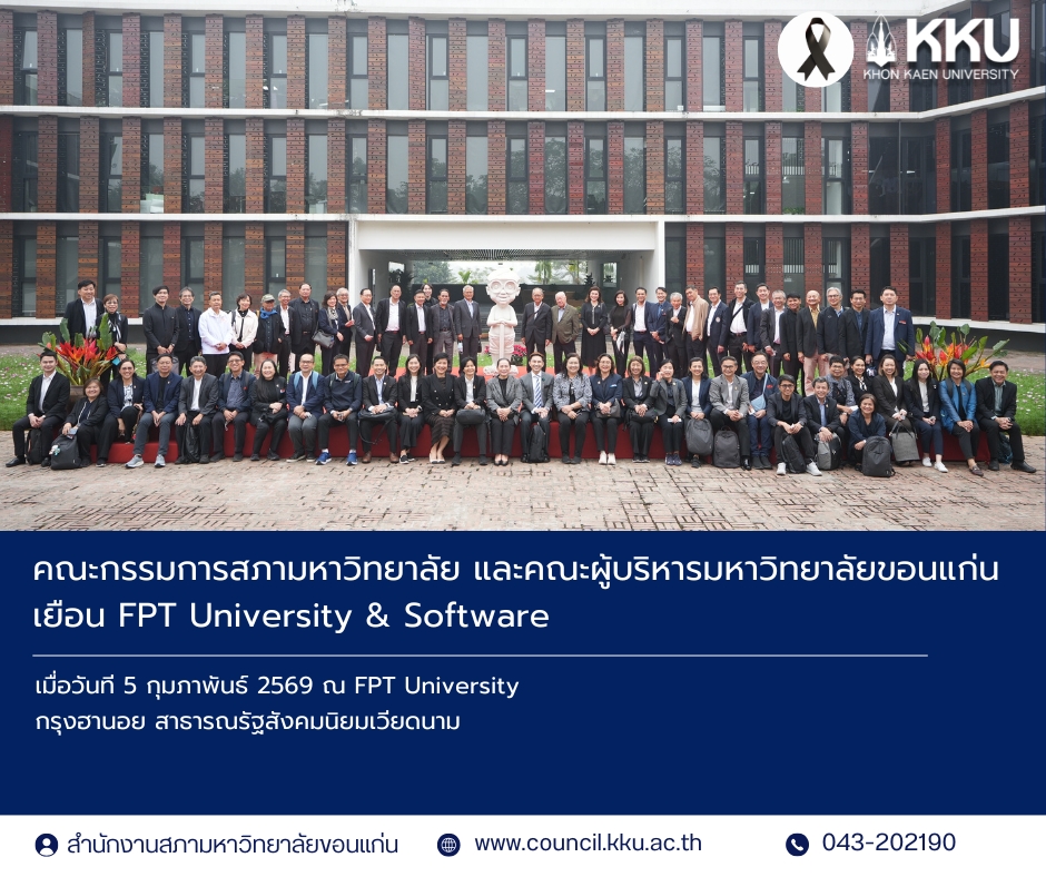 วันที่ 5 กุมภาพันธ์ 2569 คณะกรรมการสภามหาวิทยาลัย และคณะผู้บริหารมหาวิทยาลัยขอนแก่น ได้เดินทางเยือน FPT University & Software เพื่อศึกษาดูงานด้าน “Smart University” และการจัดการศึกษาแนวใหม่ที่ขับเคลื่อนโดยภาคอุตสาหกรรม (Industry-led Education)