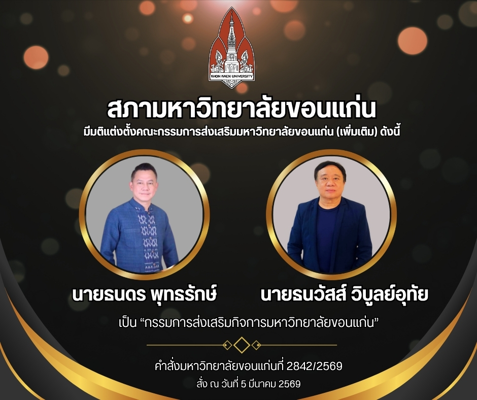 การประชุมสภามหาวิทยาลัยขอนแก่น ในคราวประชุมครั้งที่ 3/2569 เมื่อวันที่ 5 มีนาคม 2569 ณ ห้องประชุมสารสิน ชั้น 2 อาคารสิริคุณากร มหาวิทยาลัยขอนแก่น สภามหาวิทยาลัยขอนแก่นมีมติอนุมัติการแต่งตั้งกรรมการในคณะกรรมการส่งเสริมกิจการมหาวิทยาลัยขอนแก่น (เพิ่มเติม) จำนวน 2 ท่าน ได้แก