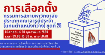 ข้อบังคับมหาวิทยาลัยขอนแก่น ว่าด้วย การเลือกตั้งกรรมการสภามหาวิทยาลัยประเภทคณาจารย์ประจำ และประเภทพนักงานมหาวิทยาลัย ซึ่้งมิใช่คณาจารย์ประจำ พ.ศ. 2559 คำสั่งมหาวิทยาลัยขอนแก่น ที่ 650/2569 เรื่อง แต่งตั้งคณะกรรมการการเลือกตั้งกรรมการสภามหาวิทยาลัย ประเภทคณาจารย์ประจำ (แทนตำแหน่งที่ว่าง) ชุดที่ 28 การขอแก้ไข/เพิ่มเติมรายชื่อ ให้ดำเนินการภายในวันที่ 9 กุมภาพันธ์ 2569 ในเวลา 08.30-16.30 น. โดยแจ้งไปยังกรรมการการเลือกตั้งฯ ประจำส่วนงานต้นสังกัด หรือ e-mail : meeting@kku.ac.th ใบสมัครรับการเลือกตั้งกรรมการสภามหาวิทยาลัย ประเภทผู้แทนคณาจารย์ประจำ (แทนตำแหน่งที่ว่าง) ชุดที่ 28 Word / PDF Application Form for the Election of University Council Members (Faculty Member Category) (To fill a vacancy), Set […]